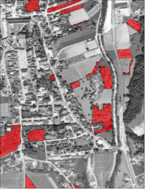 Traditional orchards (red) near Pöllau (Styria). Left: aerial photo 1960; Right: aerial photo 1992, data from 2003.